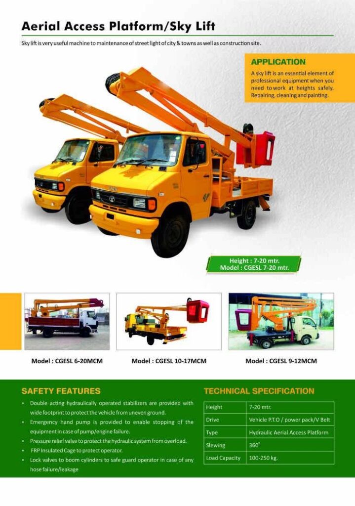 The Kishan Force Aerial Access Platform, commonly known as a Sky Lift, is a reliable and essential solution for operations at elevated heights. Designed for maintenance of streetlights, signage, building facades, and construction work, it ensures safety and efficiency while working in challenging environments. Its hydraulic system, wide stabilizers, and emergency safety features provide a secure platform for operators, while the FRP insulated cage offers additional protection against electrical hazards. Built for municipalities, utility service providers, and construction professionals, the Sky Lift combines durability, maneuverability, and precision, making high-altitude repairs, cleaning, and installations faster and safer.